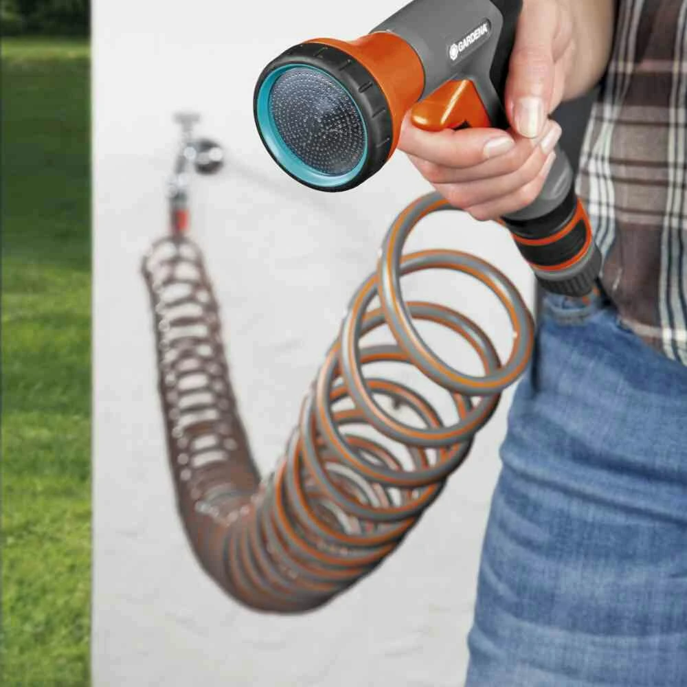 Das Spiralschlauch-Set ist die bequeme Lösung für die Bewässerung von Pflanzen auf Balkonen, Terrassen oder kleinen Gärten. Die Rückstellkraft der Schlauchspirale bewirkt, dass sich der Schlauch nach Gebrauch auf ein Minimum zusammenzieht. Damit ist er aus dem Weg, mühsames Auf- und Abrollen ist nicht mehr notwendig. Die Schlauchlänge von 10 m ist ideal zur Bewässerung von Pflanzen auf kleinen Flächen. Die beigefügte Bewässerungsbrause liegt gut in der Hand, die Wassermenge lässt sich stufenlos regulieren und der Impulsauslöser kann auf Wunsch festgestellt werden. Das GARDENA Spiralschlauch-Set ist das praktische Komplettsystem für die Bewässerung kleiner Gartenparadiese. Mit Bewässerungsbrause und Hahnverbinder.